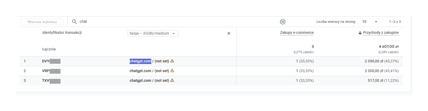 Na zrzucie ekranu powyżej widać przykład z jednego z hoteli, z którym współpracuję: 3 transakcje ze źródła chatgpt.com o łącznej wartości 4607 zł. Bez wcześniejszego ruchu organicznego i dobrze przygotowanych treści tych rezerwacji po prostu by nie było. To dowód, że da się budować widoczność w AI i przekładać ją na pierwsze przychody z rezerwacji.